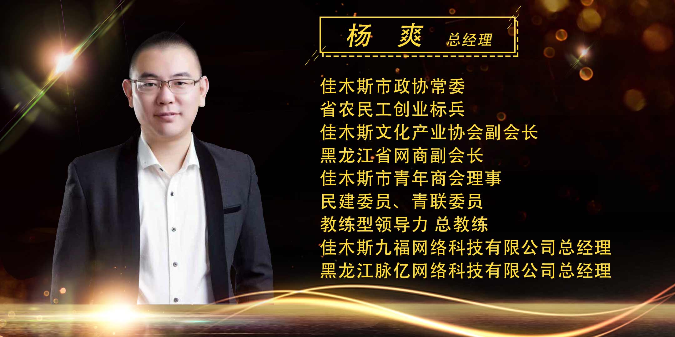 杨爽,黑龙江省农民工创业标兵,佳木斯市政协常委,佳木斯市民建会员,佳木斯市青联委员,黑龙江省网商副会长,向阳区创业者协会会长,佳木斯市青年商会理事,佳木斯九福网络科技有限公司总经理,黑龙江脉亿网络科技有限公司总经理.
